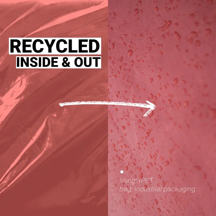 Für die Außenseite wird hier unser hauseigener Kunststoff-Recycling-Stoff verwendet. Für das Innenfutter haben wir rPET (recyceltes Polyethylenterephthalat) verwendet, ein Material, das aus Plastikflaschen hergestellt wird.