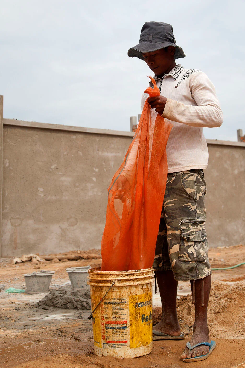 Nylonnetze sind ein Mehrzweckmaterial, das hauptsächlich für den Fischfang oder im Baugewerbe verwendet wird. In Phnom Penh sind wir ständig von diesem Material umgeben. Es hat uns so inspiriert, dass wir beschlossen haben, es umzuwidmen und es zu unserem Markenzeichen zu machen. Wir lieben es, mit den verschiedenen Farben zu spielen und sie übereinander zu legen, um endlose Kombinationen von Farben und Texturen zu erhalten.